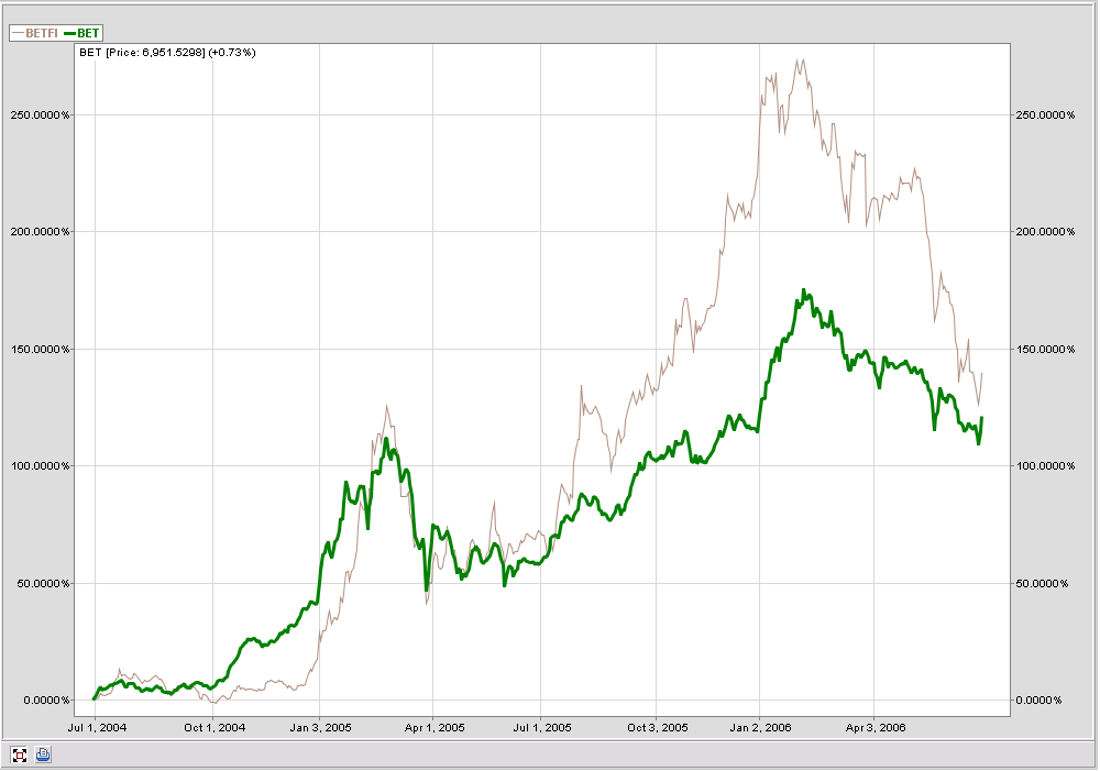 De ce este importanta rata dobanzii BCE in tot acest calcul? Pentru ca intarzierea ciclului de crestere a dobanzii a creat, intre 2004 si 2006, premisele pentru o apreciere mult mai consistenta a actiunilor europene: +37,73% pentru indicele german DAX, +30,74% pentru CAC40 si +29,73% pentru FTSE100. Nu la fel de importanta este dobanda in cazul Romaniei, tara noastra fiind intr-un proces de revenire din hiperinflatia anilor ’90, ceea ce a facut ca dobanzile sa scada constant, indiferent de contextul extern.