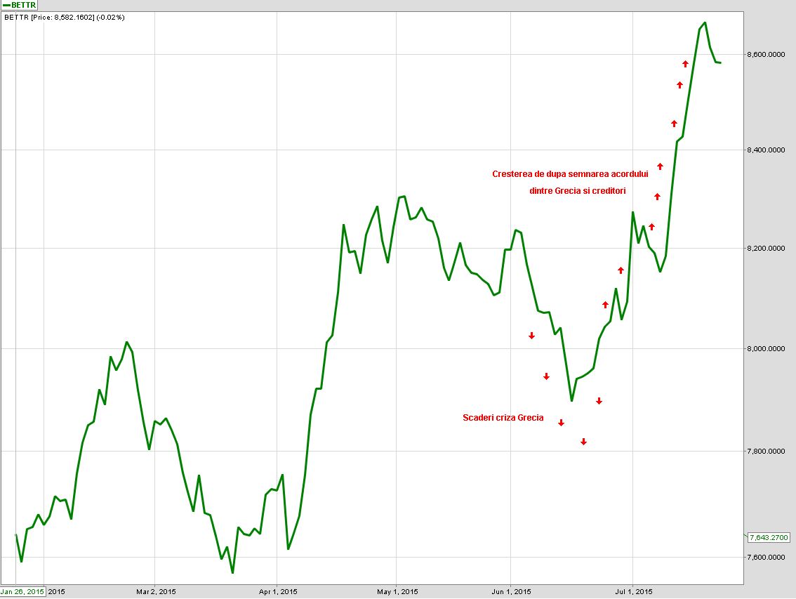 Dar de ce piata locala, indicii BVB, nu au fost intimidati de scenariile dezastruase privind Grecia? Cum am reusit noi, de data acesta, sa rezistam mai bine decat alte piete, obisnuiti fiind sa fim corelati si chiar sa exageram temerile din pietele de capital? Desi piata locala este la maximul ultimilor 7 ani, vedem in graficul de mai jos cum indicele BET-TR nu s-a lasat impresionat de faptul ca Grecia ar putea iesi din zona euro. Mai mult, cand deznodamantul a parut a fi unul poztiv, a reactionat cu maturiate si si-a asumat o crestere deloc de neglijat si asta in ape mai limpezi decat cu numai o luna in urma. Astfel, avem un prim raspuns pentru “Criza din Grecia ar putea fi avancronica unor cresteri ale burselor?”: Da, criza din mai-iunie-iulie 2015 a datoriilor Greciei a fost o noua oportunitate de a cumpara actiuni mai ieftin.