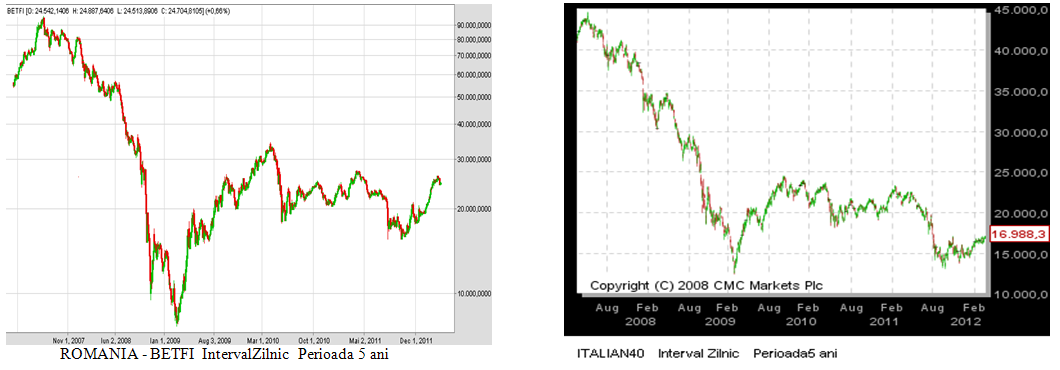 Mai jos observam graficele a doua piete, unde revenirea economica este mult mai putin evidenta. Sunt piete ce reprezinta zone economice pe care criza le-a surpins mult mai putin pregatite pentru a traversa perioade negative. Evident vorbim despre economia romaneasca si cea italiana. Putem observa cu usurinta ca revenirea este mult mai firava, mai indecisa pe masura ce investitorii asteapta semnale clare ca aceste economii pot din nou crea plusvaloare economica.