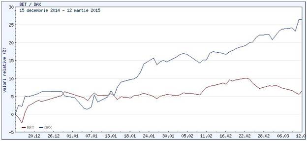 Mult asteptata decizie a Bancii Central Europene, programul de stimulare economica prin injectie de capital, a inceput deja sa produca efecte. In Germania, bursa a avansat cu 20% de la inceputul anului (indicele DAX), in vreme ce la noi, indicele BET a trecut astazi (13 martie 2015) in teritoriul negativ fata de finalul lui 2014. Asteptarile noastre erau (si sunt in continuare) ca acest quantitative easing european sa aiba repercursiuni pozitive si asupra bursei locale, chiar daca prin ricoseu, programul BCE fiind adresat tarilor din zona euro. Deocamdata, singurul rezultat pentru noi a fost ieftinirea leului in fata dolarului, de fapt... aprecierea dolarului in fata euro care a determinat.