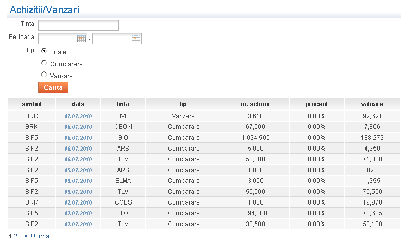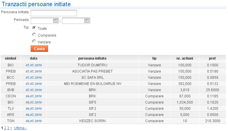 Este o facilitate importanta oferita clientilor Prime Transaction care astfel nu mai trebuie sa urmareasca comunicatele societatilor ce contin raportarea tranzactiilor, ci au toate aceste informatii prezentate clar si usor de folosit in doar cateva tabele. In plus, se poate realiza orice fel de cautare in cadrul acestor date - de exemplu se poate observa istoricul cumpararilor BIO de catre SIF-uri sau istoricul tranzactiilor de cumparare / vanzare pe care le opereaza SIF-urile in portofolii.