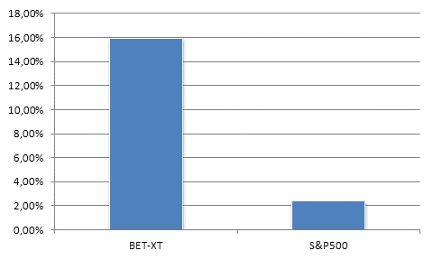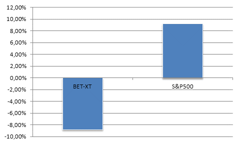 In aceste conditii piata romaneasca a inceput sa performeze in raport cu alte piete bursiere. Comparand evolutia pietei autohtone (la nivel indicelui BET-XT) cu principala piata bursiera, cea americana (la nivelul indicelui S&P500) observam o divergenta majora.
