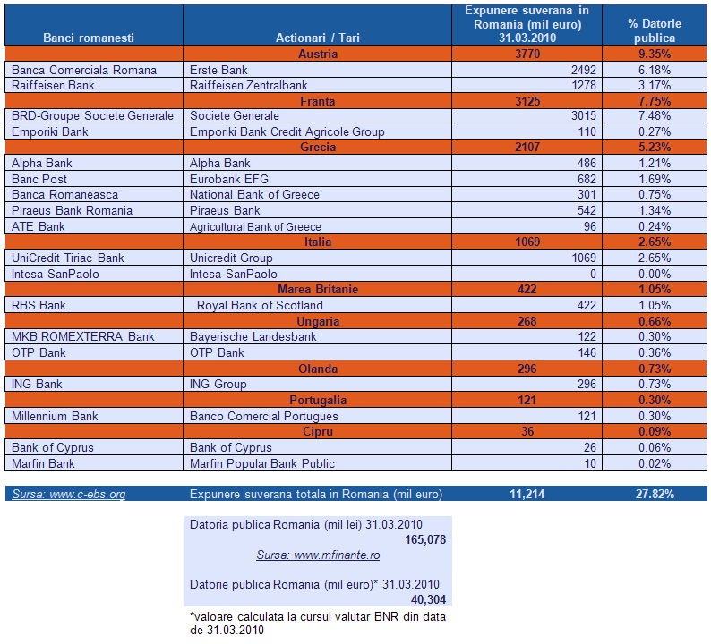 In acest moment aceste banci prin intermediul subsidiarelor din Romania finanteaza aproximativ 28% din datoria publica. Raman insa procente semnificative ale datoriei publice acoperite din imprumutul de la FMI si imprumuturi de la alte institutii de credit (cele care nu au publicat expunerile suverane in Romania sau cele din afara zonei Euro), fonduri de investitii sau alti investitori privati. Este de subliniat faptul ca rezervele valutare si aur ale BNR la data analizata de noi, 31 martie 2010, erau de 34.784 mil euro ceea ce ar acoperi 86.3% din totalul datoriei publice. Pentru moment pozitia Romaniei nu pare sa fie una deloc disproportionata, dar totul depinde de evolutia economica in 2011.