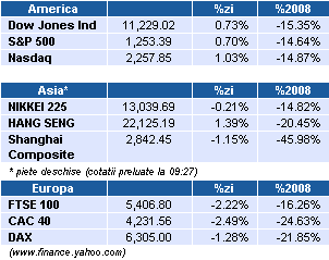 nou maxim inurmaanuntului Chinei referitor la reducerea cu 10% a productiei de aluminiu in vederea reducerii consumului energetic (MarketWatch.com); - indicii din Hong Kong inregistreaza cresteri conduse de sectorul bancar sustinut de asteptarile ca autoritatile americane sa intervina in cazul celor doua companii de imprumuturi ipotecare, Fannie Mae si Freddie Mac, dar si de companiile influentate direct de aprecierea pretului petrolului cu peste 5 dolari pe baril, iar cel japonez sichinez se afla pe scadere in urma evolutiilor companiilor metalurgice si cele din domeniul financiar dar si datorita marcarilor de profit (Bloomberg.com); - nivelul revizuit al productiei industriale a crescut in Japonia in luna mai cu 2,8%, ritm mai lent decat cel estimat de 2,9% (ForexFactory.com); - europenii au inchis penultima sedinta a saptamanii pe scaderi sub influenta aprecierii pretului petrolului, a sectorului bancar a carui evolutie s-a corelat cu a celui american afectat de ingrijorarile referitoare la rezultatele ce urmeaza a fi raportate saptamana viitoare (CNBC.com); - banca centrala a Angliei a confirmat asteptarile si a mentinut si in aceasta luna dobanda de politica monetara la nivelul de 5%; - Barclays a redusestimarile privind cresterea economiei Marii Britanii in acest an de la 1,7% la 1,4%, ca urmare a scaderii cheltuielilor de consum; - astazi urmeaza sa fie publicate date referitoare la balanta comerciala a SUA, sentimentul consumatorilor din SUA calculat de Universitatea din Michigan (UoM Consumer Sentiment) (ForexFactory.com). |