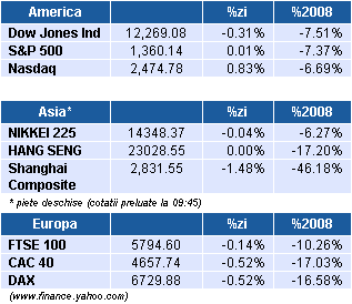 Pe piata RGBS, titlurile Argus Constanta (UARG) au inregistrat o scadere de 2,2% pana la 2,7000 lei/actiune, pe un rulaj total de 0,2 milioane de lei. - peste ocean prima sedinta din saptamana a fost una calma, indicii inchizand pe cresteri usoare, evolutia acestora fiind afectata atat de indicele care reflecta conditiile generale de afaceri din New York publicat de catre New York Federal Reserve cat si de evolutia pretului petrolului care a stabilit un nou maxim (LaTribune.fr); majorarea productiei a determinat pentru scurt timp o scadere sensibila a pretului, insa deprecierea dolarului a urcat pretul barilului pana la aproape 140 de dolari; - pe pietele asiatice predomina rosu, cei mai afectati de scaderi fiind exportatorii, doar sectorul financiar reducand din pierderile inregistrate (CNBC.com); - Japonia a redus estimarea economica generala pentru prima data in ultimele trei luni in urma profiturilor scazute obtinute de exportatori, producatorii industriali si corporatii (BusinessStandard.ro); - indicii europeni au inchis toti pe rosu condusi de sectorul bancar si de temerile analistilor ca aprecierea costurilor materiilor prime ar putea afecta profiturile companiilor din industria alimentara si a transportului aerian, dar si de nivelul inflatiei inregistrat in mai in zona euro si a indicelui conditiilor generale de afaceri publicat de New York Federal Reserve; - inflatia anuala in zona euro a crescut in luna mai la nivelul de 3,7%, maxim al ultimilor 16 ani, fata de 3,3% cat se inregistra in aprilie si peste estimarea de 3,6%, in urma cresterilor preturilor la alimente si energie (Bloomberg.com); - astazi urmeaza ca Goldman Sachs sa raporteze rezultatele pe cel de-al doilea trimestru si sa fie publicate date privind rata anuala a inflatia anuala in Marea Britanie, balanta comerciala la nivelul zonei euro, inflatia exprimata in preturile producatorilor in SUA, nivelul productiei industriale in SUA (Forexfactory.com).