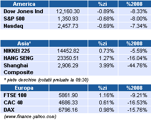 In segmentul Rasdaq, valoarea totala tranzactionata a fost de 2,3 milioane de lei (0,6 milioane de euro), cel mai activ titlu fiind Iproeb Bistrita (IPRU) cu aproape 0,2 milioane de lei. Cursul a crescut cu 1,4% pana la 4,3100 lei/actiune, maximul sedintei. - indicii americani au inchis toti pe scadere in urma publicarii datelor privind inflatia in crestere, incetinirea inregistrata de productia industriala si declaratiei facuta de Goldman Sachs potrivit careia bancile vor fi nevoite sa stranga capital aditional (CNNMoney.com); - rata inflatiei exprimata in preturile producatorilor in SUA a crescut in luna mai cu 1,4%, mai mult decat asteparile din piata de crestere cu 1% si decat cresterea de 0,2% din aprilie (Forexfactory.com); -nivelul productiei industriale in SUA a cunoscut in luna mai o scadere cu 0,2%, sub estimarea de apreciere cu 0,1% (Forexfactory.com); - pietele asiatice au trecut pe cresteri pe masura ce aprecierea titlurile companiilor din sectorul minier si a dezvoltatorilor imobiliari japonezi a acoperit declinul usor inregistrat in sectorul bancar (Bloomberg.com); - titlurile europene au inregistrat cresteri in urma evolutiei preturilor marfurilor ceea ce a determinat aprecierea titlurilor din sectoarele minier si energetic, iar sectorul bancar a fost influentat pozitiv de raportarea rezultatelor de catre Goldman Sachs (CNBC.com); - balanta comerciala la nivelul zonei euro a inregistrat in luna mai un excedent de 2,2 mld. de euro, atat peste deficitul estimat de 0,5 mld. de euro cat si peste deficitul inregistrat in luna aprilie de 1,1 mld. de euro (Forexfactory.com); - inflatia in Marea Britanie a crescut in luna mai peste asteptarile de 3,2% pana la nivelul de 3,3%, cel mai inalt nivel din 1997 (Forexfactory.com); - ZEW Economic Sentiment a scazut in Germania pana la 52,7, mult sub valoarea asteptata de -43,9 (Forexfactory.com) - astazi urmeaza sa fie publicate date privind rezervele de petrol ale SUA (Forexfactory.com).