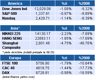 Titlurile Cars Tarnaveni (CARS) s-au remarcat printr-o apreciere de 8,3% pana la 6,5000 lei/actiune, pe un rulaj de 0,9 milioane de lei. - indicii americani au scazut ieri in urma evolutiei titlurilor din sectoarele financiar si auto si a rezultatelor raportate de FedEx si Morgan Stanley (CNBC.com) - FedEx Corp. a anuntat pierderi pe cel de-al patrulea trimestru, mai mari decat estimarile analistilor, in urma cresterii preturilor combustibililor si a incetinirii economice, totodata compania si-a revizuit in scadere previziunile privind anul fiscal 2009 (CNNMoney.com); - Morgan Stanley a raportat astazi un profitul operational pe trimestrul doi in scadere pana la putin peste 1 mld. de dolari fata de 2,36 mld. de dolaricat inregistra in perioada similara a anului trecut ca urmare a conditiilor de pe piata creditelor (Bloomberg.com); - rezervele de petrol ale SUA au scazut in ultima saptamana cu 1,2 milioane de barili, mai putin decat estimarea de -1,5 milioane de barili (Forexfactory.com); - indicii asiatici inregistreaza scaderi semnificative conduse de companiile producatoare de masini si a celor tehnologice in urma ingrijorarilor privind masura in care deprecierea dolarului si scaderea cererii venite din partea SUA vor afecta rezultatele companiilor. Indicele chinez a inregistrat scaderi mai abrupte ca urmare a temerilor privind masurile pe care guvernul le va lua pentru a combate inflatia (Bloomberg.com); - in Europa indicii au inchis pentru a doua zi consecutiv pe scaderi in urma temerilor privind criza financiara, influenta incetinirii economice si a deprecierii activelor asupra profiturilor inregistrate de companii (Bloomberg.com); - potrivit Financial Times, France Telecom ar putea imbunatati oferta pentru TeliaSonera printr-un surplus de cash (CNBC.com); - astazi urmeaza sa fie publicate date privind vanzarile cu amanuntul in Marea Britanie (Forexfactory.com).