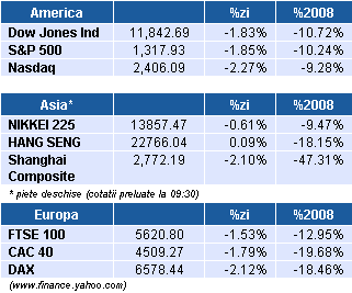 - scaderile au caracterizat si ultima zi din saptamana, atat peste ocean cat si in Europa, in urma ingrijorarilor privind pretul in crestere al petrolului, riscurile la care sunt inca expuse companiile din sectorul financiar si deteriorarea pietei automobilelor. Indicele Dow a coborat sub pragul de 12.000 atingand minimul ultimilor 3 luni (LaTribune.fr); - Moody’s Investors Service a redus ratingurile de tip AAA ale Ambac Financial Group Inc. si MBIA Inc. (Bloomberg.com); |