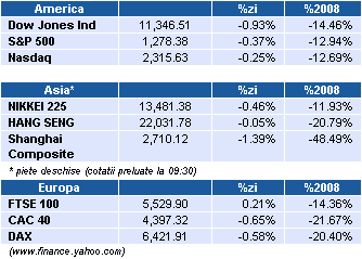 In segmentul Rasdaq, valoarea totala tranzactionata a fost de 2,1 milioane de lei (0,6 milioane de lei), cele mai active titluri fiind titlurile Armax Gaz (ARAX) cu 0,3 milioane de lei. Cursul a inregistrat o scadere de 0,6% pana la 0,1650 lei/actiune. - peste ocean indicii au terminat saptamana pe scaderi usoare, in urma evolutiei pretului petrolului care a atins un nou maxim depasind nivelul de 142 de dolari pe baril si a scaderilor inregistrate in sectorul financiar (CNBC.com); - pietele asiatice au inceput saptamana pe scaderi, investitorii fiind ingrijorati de efectul pretului petrolului asupra sanatatii economiei, de inflatie si de inregistrarea de pierderi suplimentare de catre companii (Bloomberg.com); - economia Marii Britanii si-a incetinit cresterea in primul trimestru, valoarea PIB-ului scazand de la 0,6%, cat se inregistra in trimestrul IV, la 0,3%; - deficitul comercial la nivelul zonei euro a scazut in aprilie la 0,3 mld. de euro fata de 13,2 mld. de euro in luna martie ca urmare a surplusului inregistrat de comertul cu bunuri; - astazi urmeaza sa fie publicate date referitoare la rata anuala a inflatiei in zona euro (ForexFactory.com).